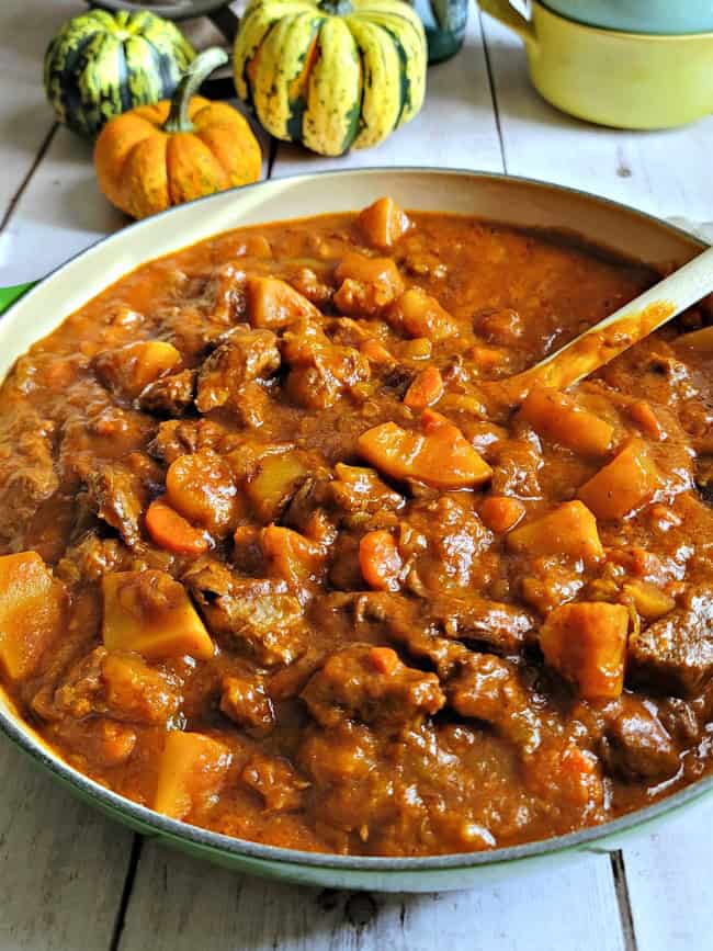 But apples aren’t the only ingredient that makes this stew perfect for fall. This homemade beef stew also includes bite-size chunks of squash (or pumpkin) for an authentic fall flavor. But really, you don’t have to wait until fall to make this beef stew because it’s just as good in the winter or anytime you’re craving a hearty beef stew.