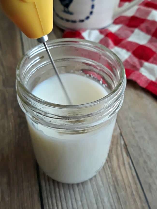 - Carefully, pour milk into a small jug or mason jar, and use frothing wand to froth the milk until light and foamy.