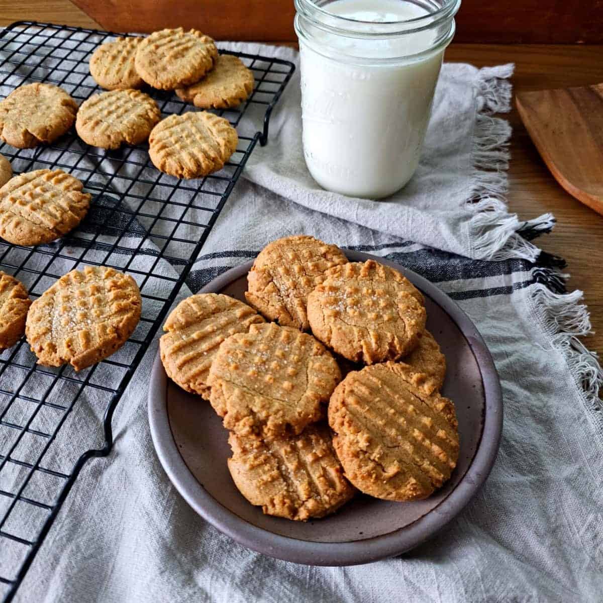 These old-fashioned peanut butter cookies are a nostalgic goody that brings back so many memories for me. Peanut butter cookies were a staple in our school cafeteria and something my mom would bake regularly. And back in those days, nothing beat a freshly baked peanut butter cookie and a glass of milk for a sweet snack (I still do kinda feel that way!).