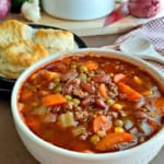 A homestyle soup that’s loaded with fresh vegetables and ground beef and slowly simmered in a savory tomato beef broth. This makes a big batch so you’ll have plenty for the freezer!