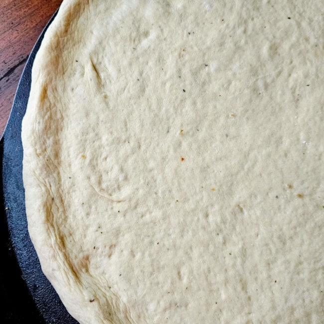 Also, this is a very versatile dough. You can use it not only for pizza, but for breadsticks, calzones, stromboli, and even garlic knots. And it can be a thick or a thin crust. I will often make a thick-crust pizza in my cast iron skillet. Or sometimes I will make 2 thin-crust pizzas out of a single batch of dough. Or make it into 4 personal size pizzas. There are so many ways to use this dough that you’ll want to make an extra batch to keep on hand in the freezer.
