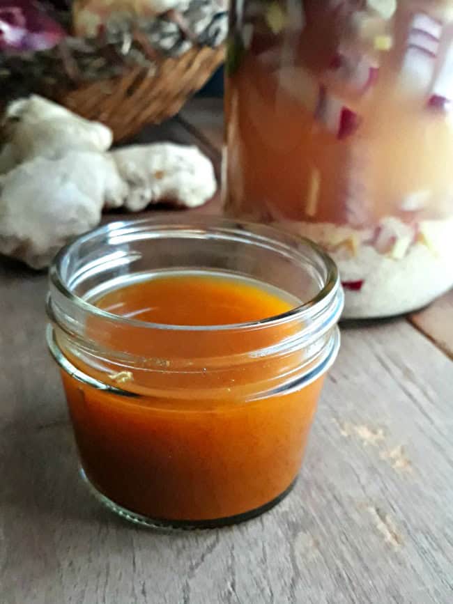 - After 3-4 weeks, strain out the vegetables and reserve the liquid. Gently warm some honey, and add it to the strained Fire Cider to your taste.