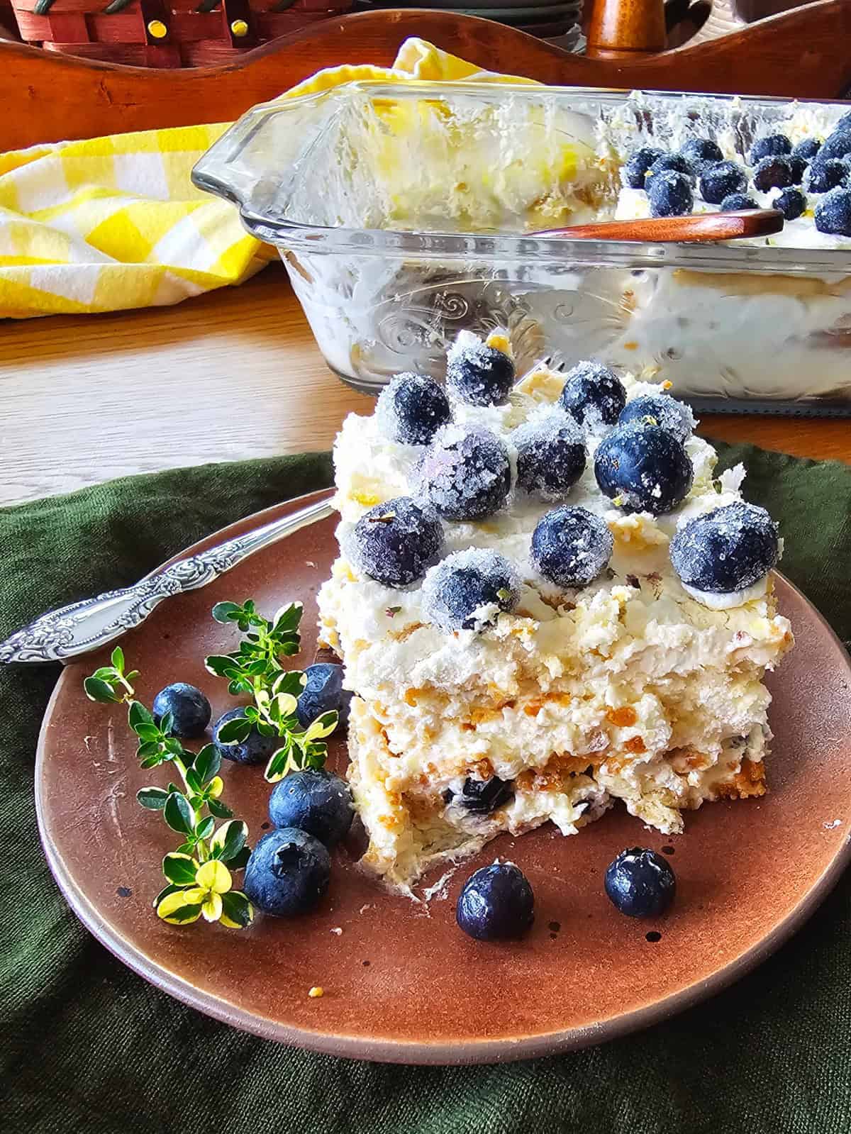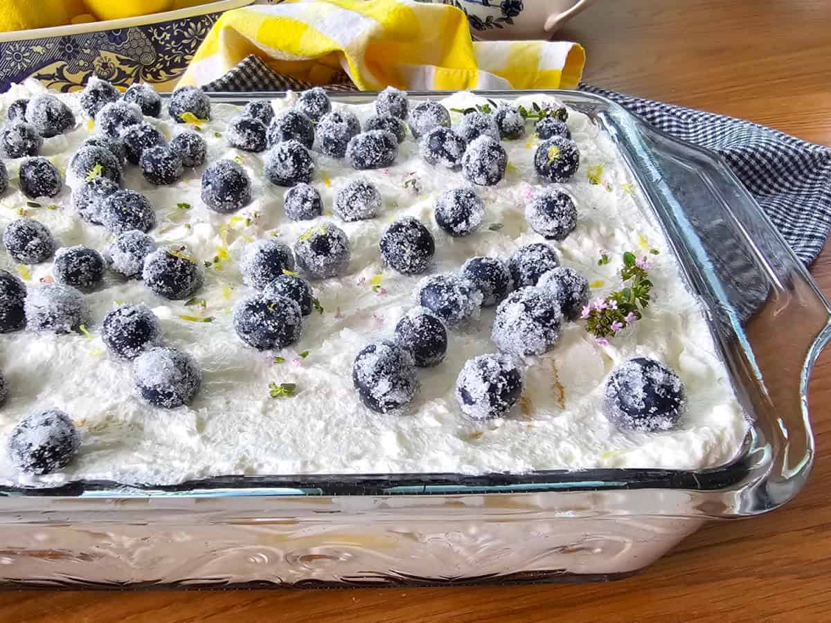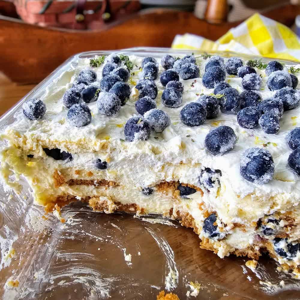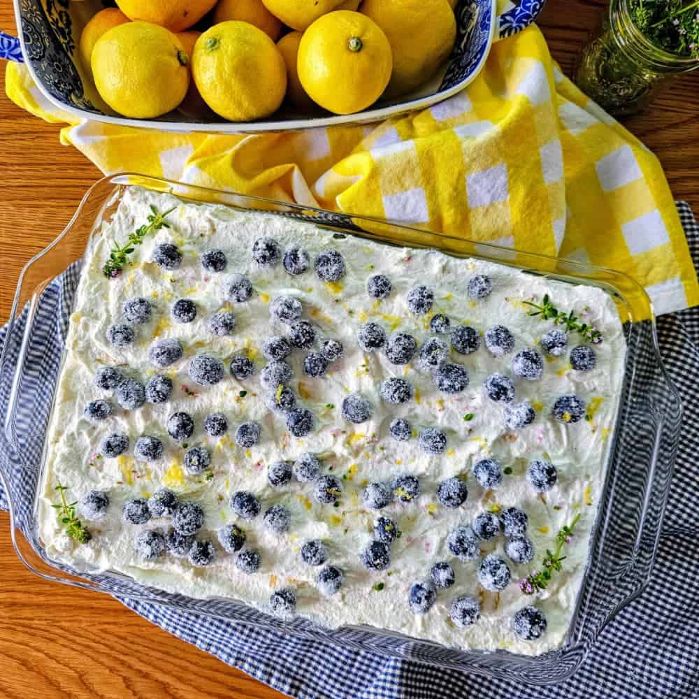 I especially love that this cake feels both nostalgic and elegant. It reminds me of the classic 1960s refrigerator desserts my grandmother used to make. But this version has a little extra homemade love stirred in, with real lemon curd, a cloud of whipped cream, and juicy berries in every bite. The combination of bright lemon and sweet berries is pure sunshine on a plate, and the sugared blueberry garnish on top makes it feel just a little extra special. You can make it a day ahead and let it chill overnight, which makes it perfect for easy entertaining or slow summer weekends.