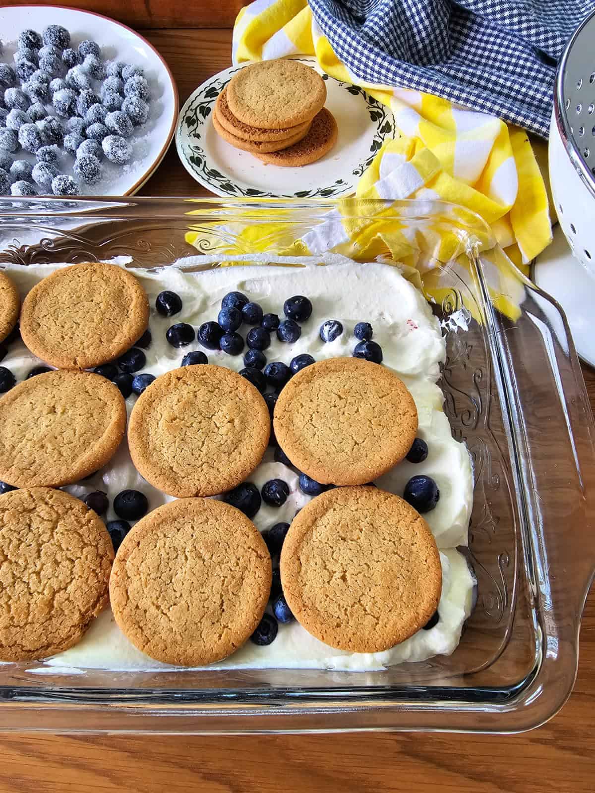 This dessert is best when chilled overnight, allowing the cookies to soften into tender, cake-like layers. It can be made up to 24 hours in advance and stored covered in the refrigerator. Garnish with sugared blueberries just before serving to keep them crisp.