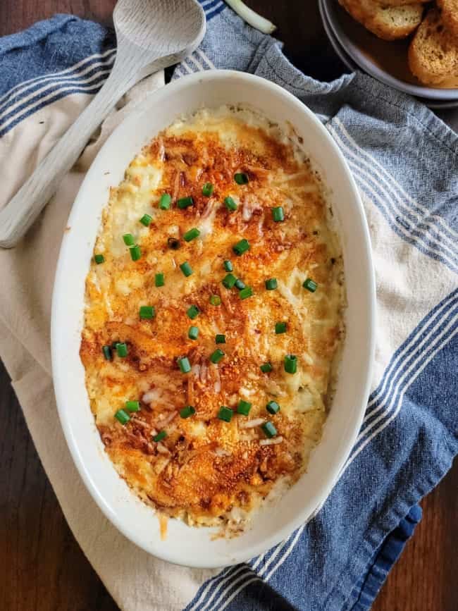 - Garnish the top with chopped green onions. Serve warm with crostini, crackers, chips, or raw vegetables.