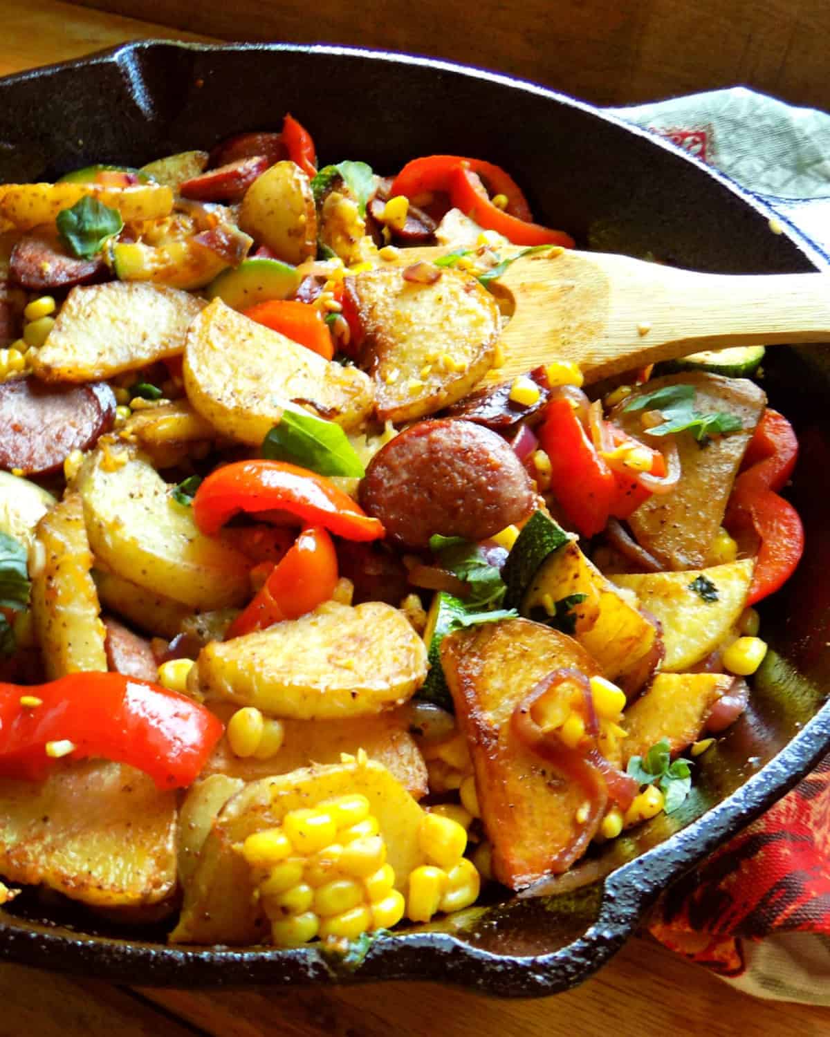 - Add sausage and potatoes back to the skillet, combining with the cooked vegetables. Stir in 1 teaspoon of apple cider vinegar, and the chopped fresh basil.