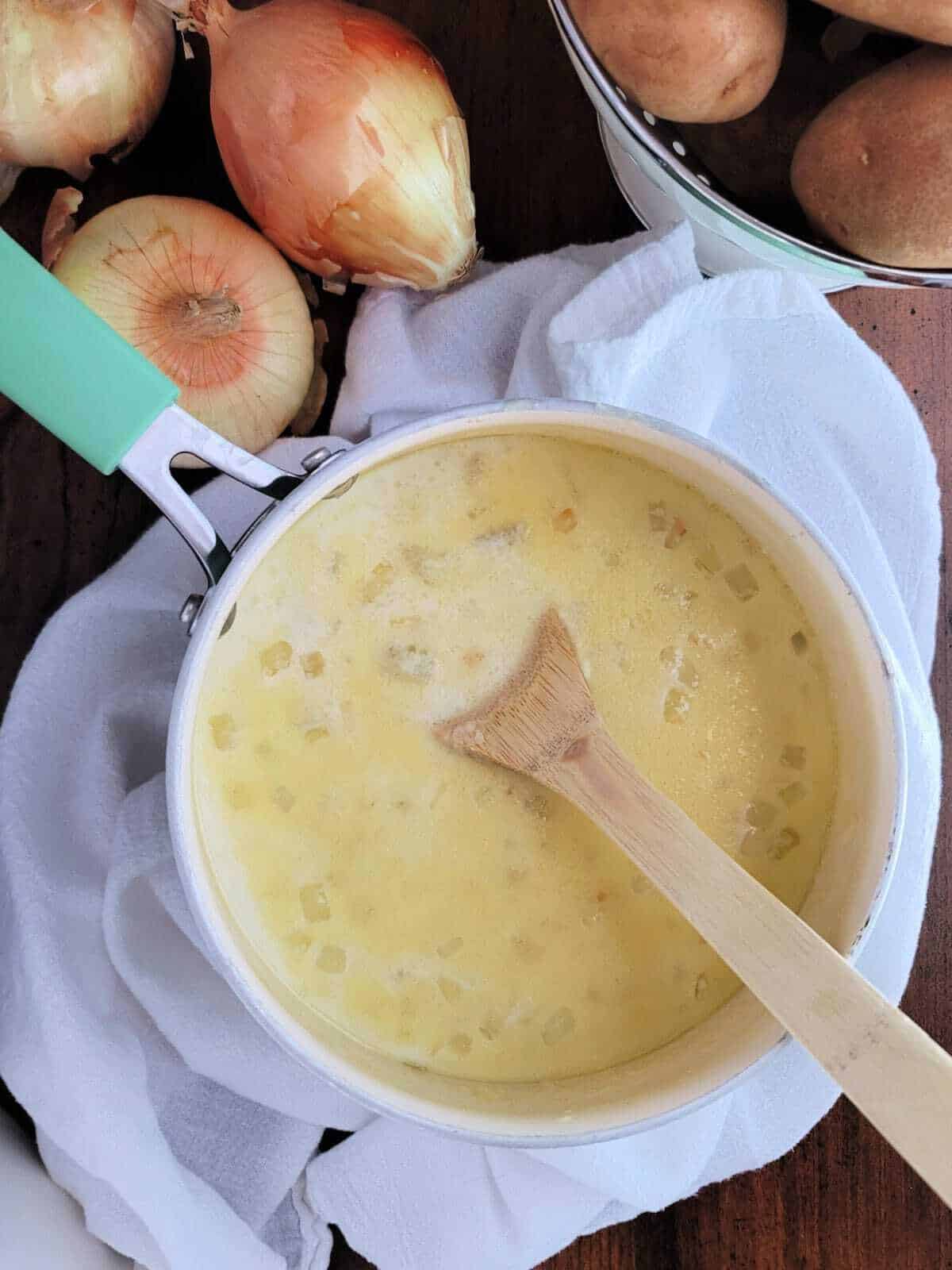 - While the potatoes are boiling, heat butter over medium heat in a Dutch oven or soup pot. Add onions to the butter and cook until soft and golden brown around the edges.