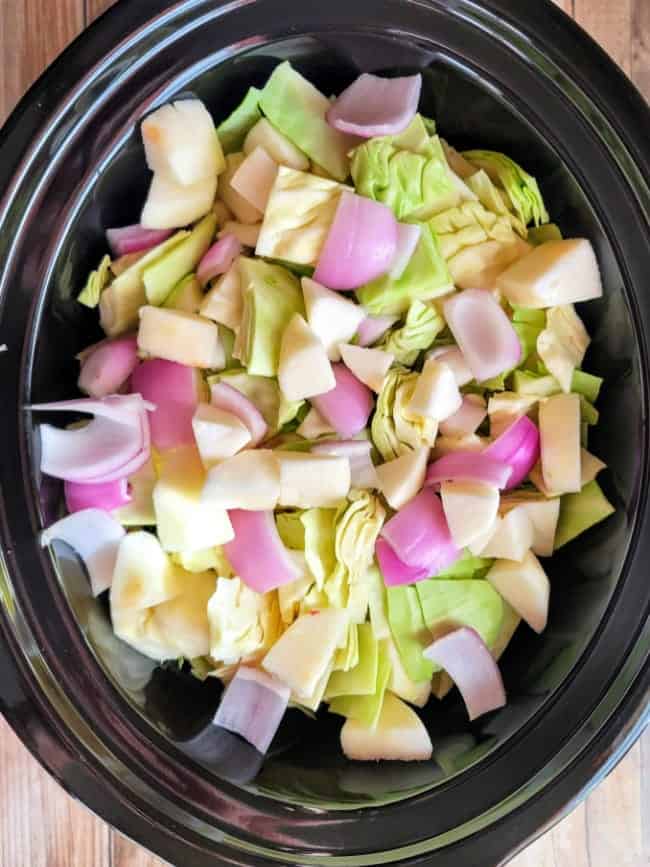 - Add the shredded cabbage, onion, apple, and garlic to your slow cooker. Toss to combine.