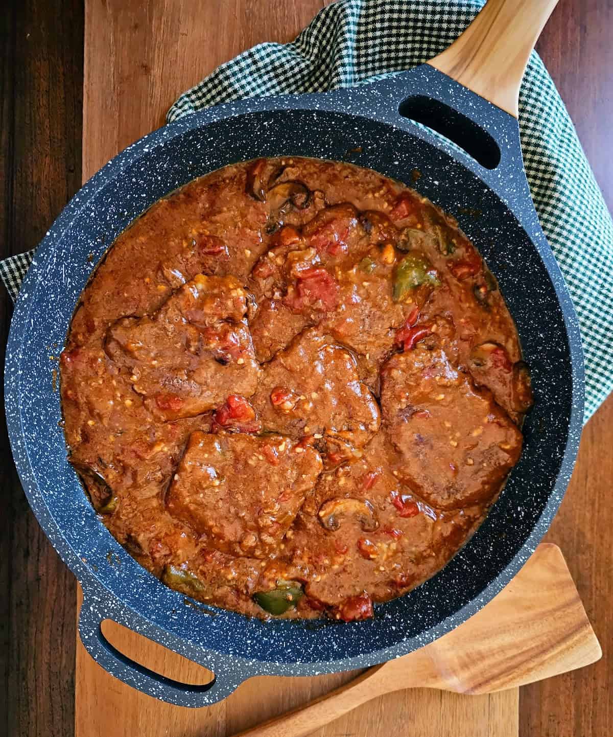 This Old-Fashioned Swiss Steak recipe is my take on the classic version of this recipe. With mushrooms, bell peppers, and onions all slow-cooked in a rich beefy tomato gravy, this smothered swiss steak is meltingly tender and full of flavor. It’s perfect for a cozy family dinner or whenever you’re craving some good old-fashioned comfort food. (If you’re a fan of hearty comfort food, like me, you’ll want to check out my recipes for Old-Fashioned Potato Soup, Stuffed Cabbage Soup, and One Pot Ground Beef Stroganoff.)
