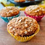 - Divide the batter evenly between the muffin cups ( they will be filled about ¾ of the way to the top.) Sprinkle the remaining 2 tablespoons of oats over the tops of the muffins. Dust with a little bit of coarse sugar (optional).