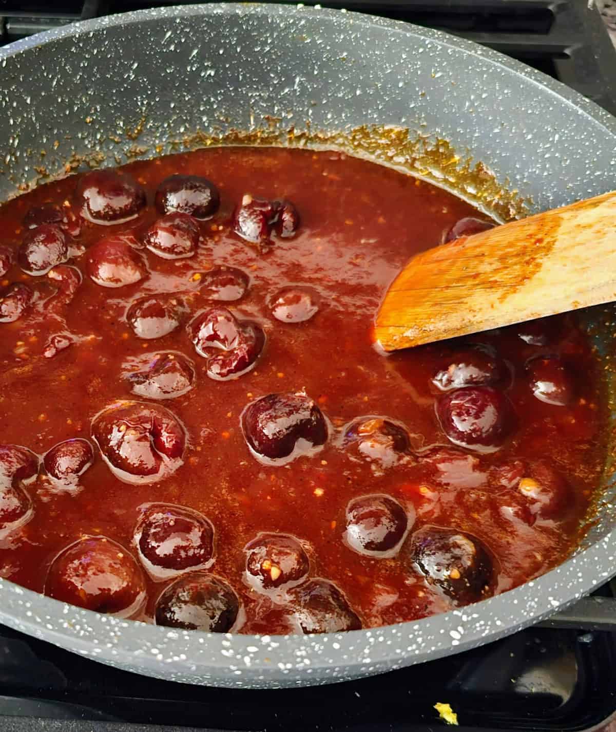 - Bring the mixture to a gentle simmer. Reduce heat to low and let it simmer uncovered for 15–20 minutes, stirring occasionally, until the cherries are softened and the sauce has thickened slightly.